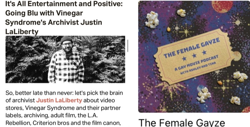 Next, Eric conducted an e-interview with Justin LaLiberty, the passionate and knowledgeable (not to mention Letterboxd-famous) film archivist on staff at cult-film specialists Vinegar Syndrome. Fans of that label and the state of home-video in general should be sure to check this one out! Beyond proudly carries dozens of VS titles; if you’re new to their work, this piece shouts out quite a few great starting places.