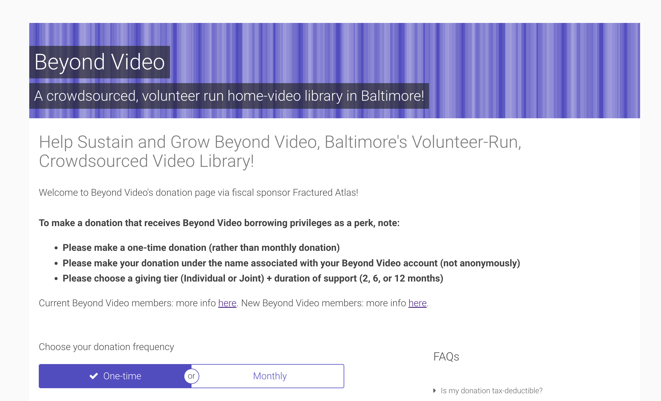 One quick action is needed for you to continue your membership at Beyond Video: make a new donation to Beyond Video through our non-profit fiscal sponsor, Fractured Atlas.